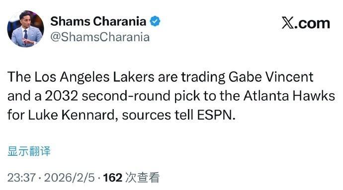 根据ESPN名记Shams报道,湖人与老鹰完成2换1交易,湖人将文森特和2032年次轮签送至老鹰,换回神射手肯纳德,有望提升湖人的外线投射能力。