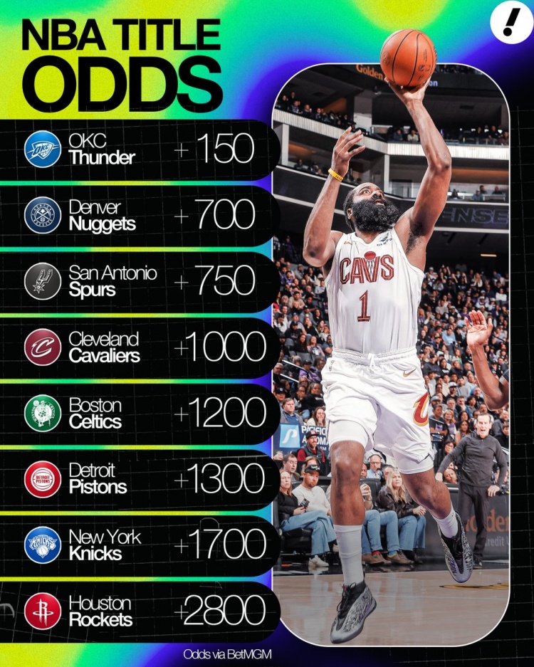 夺冠赔率:雷霆+150第1 掘金2&马刺3 骑士+1000第4 火箭+2800第8